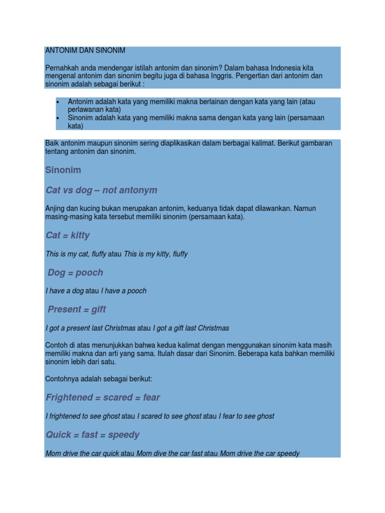 Materi Sinonim Dan Antonim from image.slidesharecdn.com Contoh kalimat antonim dalam satu kalimat. Maybe you would like to learn more about one of these? Check spelling or type a new query. We did not find results for: